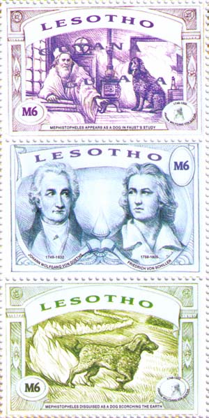 Марки изданы в малом листе. На поле листа портрет Гете (Йозеф Карл Штилер, 1828, Мюнхен, Новая Пинакотека, фрагмент) и сцены из «Фауста».