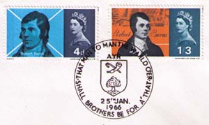 Эр. Первый день серии марок М408/409. Герб, строка из стихотворения Бернса «That man to man the ward o'er...».