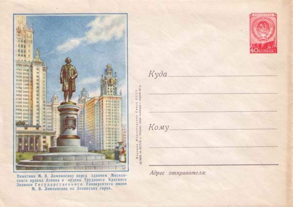 Памятник Ломоносову в Москве перед зданием МГУ на Воробьевых горах (скульптор Николай Томский, архитектор Л. В. Руднев, 1954).