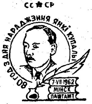 Минск. 80 лет со дня рождения Янки Купалы. Портрет Янки Купалы, книги, чернильница с пером.